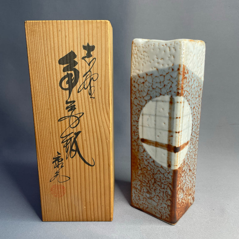 This square-shaped Shino ceramic vase is handmade by Japanese potter Yasumoto Sato (佐藤康元).